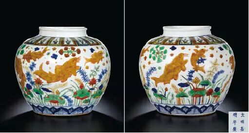 明嘉靖 五彩“荷塘鱼藻”纹罐