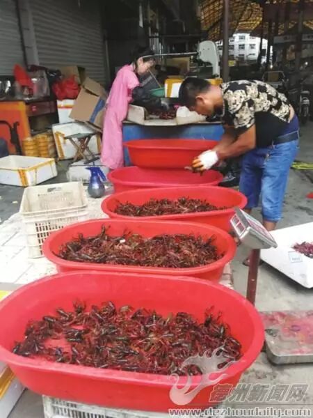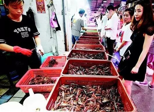 记者了解到,主城区市场上的小龙虾大部分来自迎宾大市场和黑马批发市场这两大市场。