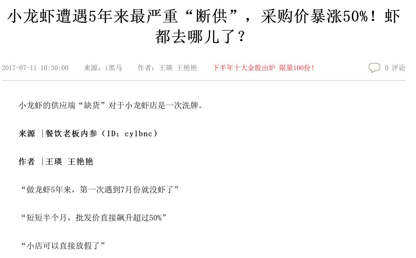 据了解,5月上旬的小龙虾货源,大多是来自省内各产区的池塘虾,亩产量最大。到了6月,小龙虾的消费最旺季到来,但第一季的池塘小龙虾已所剩不多,供应量便开始减少,从而形成了6月底至7月初时的旺季大涨价现象。