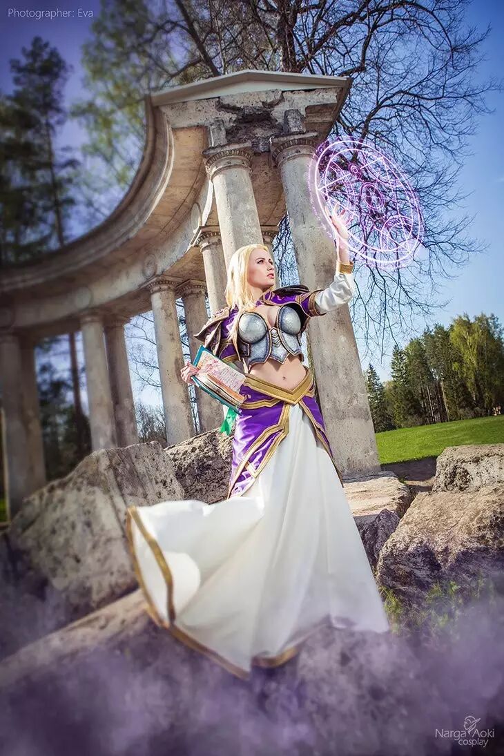 narga是一名生于1993年的俄罗斯妹子,非常喜欢Cosplay,尤其是Cos《魔兽世界》主题的角色。实际上这也不是narga第一次Cosplay吉安娜这个形象,在几个月之前他就和她的搭档并且去年称为了她的丈夫的Aoki一同上演了一场吉安娜与巫妖王阿尔萨斯的Cosplay: