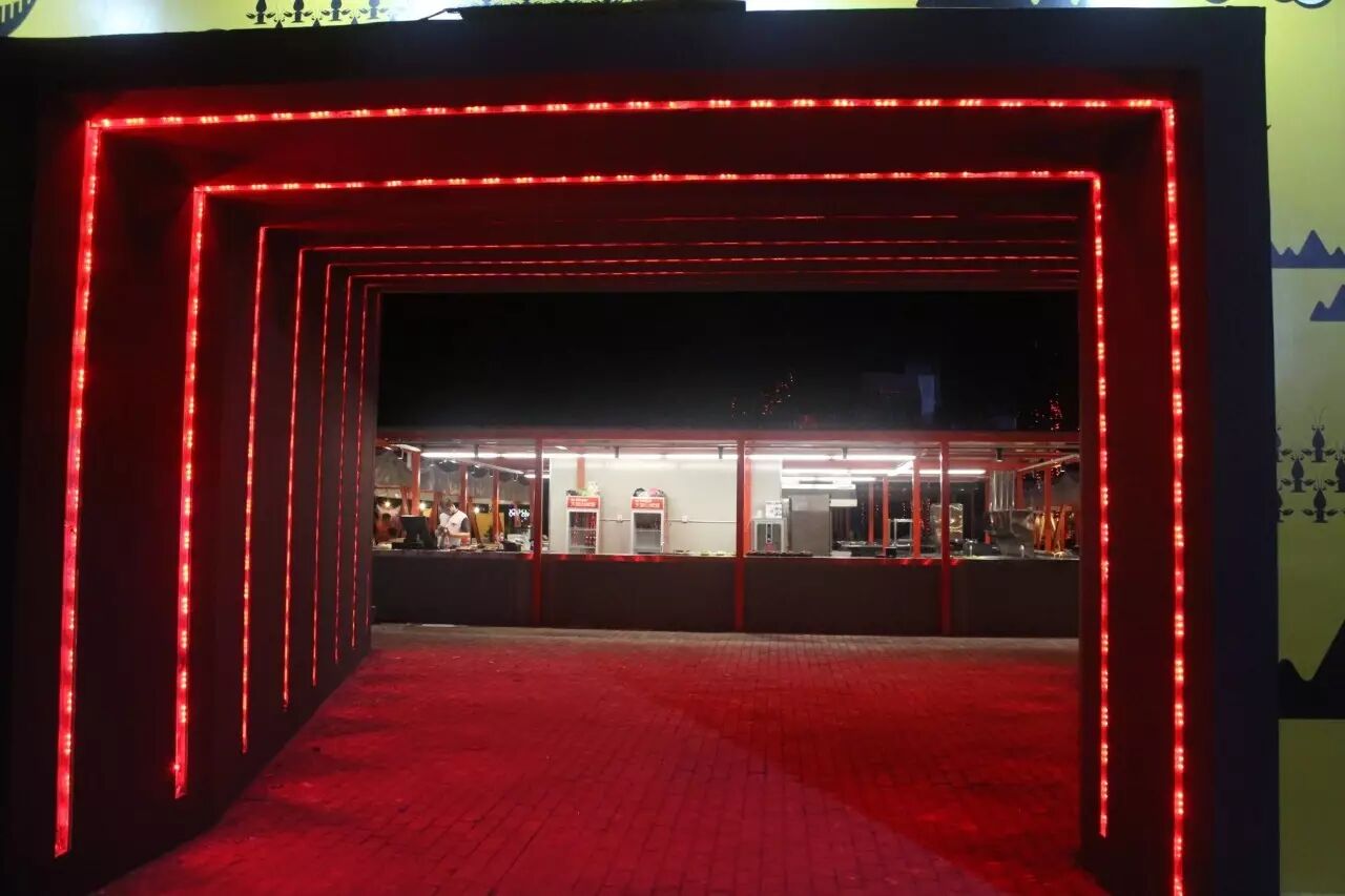 一进来就看到偌大一个以正红色框架为主的场地,露天搭建,以白炽灯做点缀,还没坐下,便能闻到空气中弥漫的小龙虾的味道。整个画面的红色,就好像烧熟的小龙虾外壳一样,让人食指大动,迫不及待。
