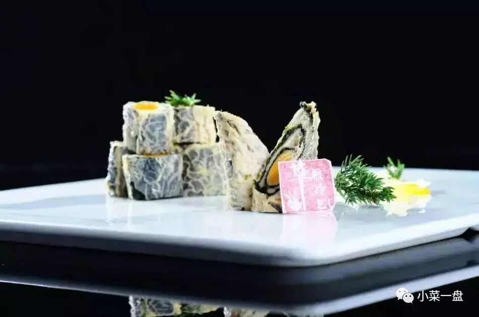 先将鸡蓉和虾蓉制成咸鲜味里面放些(香菇、胡萝卜末)少许,咸蛋黄制成细的条形,然后将腐衣2张海苔1张和咸蛋黄条、肉蓉卷好上笼蒸二十五分钟,凉后改刀装盆即可。