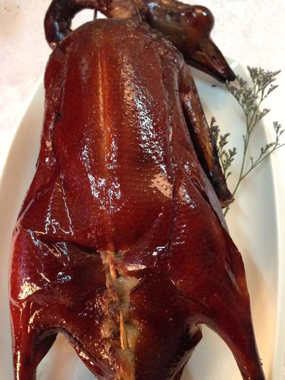选用清远乌鬃鹅,其肉质鲜美,体质结实,骨骼小,肉嫩而多汁。七斤左右,洗干净后腌,要用鹅酱、淮盐,还有腌鹅盐;腌鹅盐大约有十多种成分:花椒、八角、甘草、陈皮等等。大概腌5个小时左右,腌好用滚水淋洗,再上皮水;皮水里面有麦芽糖、醋、柠檬,还有一点酒,还有其他秘方。然后在风房吹大概6-8个小时,然后烧大概40分钟。一个化皮烧鹅整个过程要大概15个小时。