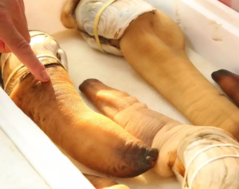 师傅介绍,象拔蚌有干蚌和湿蚌。干蚌一般去水养,干蚌中的沙皮(有磨砂般的皮)是可以做刺身的,产地在挪威,180元一斤。湿蚌是养在水里,产地朝鲜,才40元一斤。两者均可做刺身,区别在水域产地和口感。