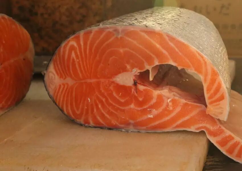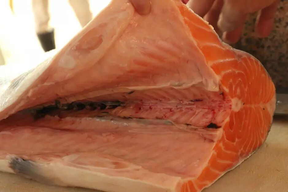 师傅介绍,新鲜的三文鱼具备一层完整无损、带有鲜银色的鱼鳞,透亮有光泽。鱼皮黑白分明,无瘀伤。眼睛清亮,瞳孔颜色很深而且闪亮。鱼鳃色泽鲜红,鳃部有红色黏液。鱼肉呈鲜艳的橙红色。用手指轻轻地按压三文鱼,鱼肉不紧实,压下去不能马上恢复原状的三文鱼,就是不新鲜的表现。