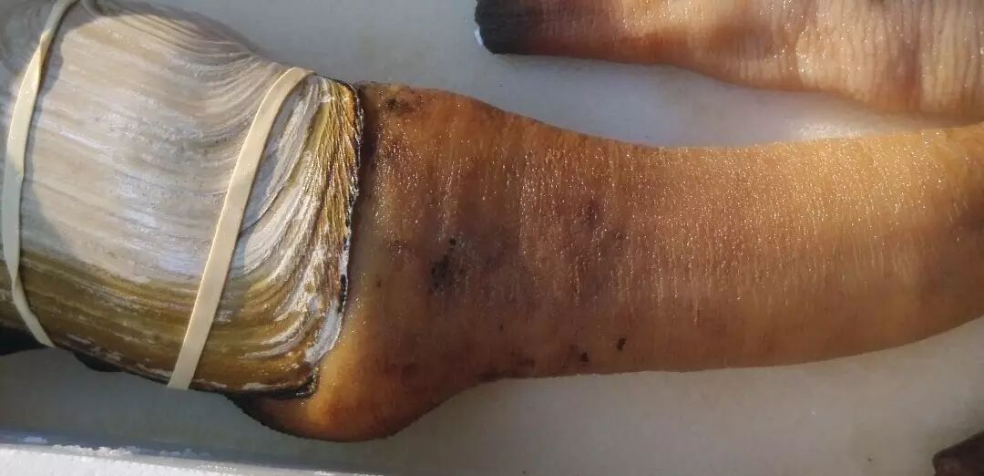 象拔蚌,原产地在美国和加拿大北太平洋沿海,因其又大又多肉的红管,很似大象的鼻子(象拔)被人们称为“象拔蚌”。