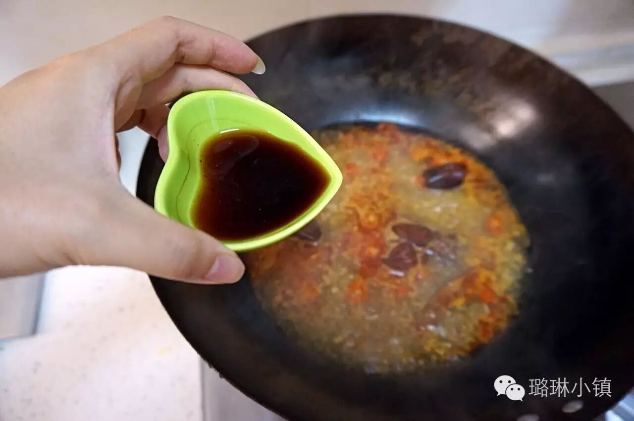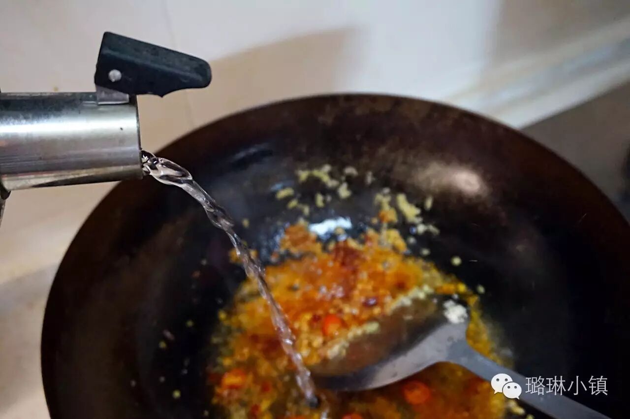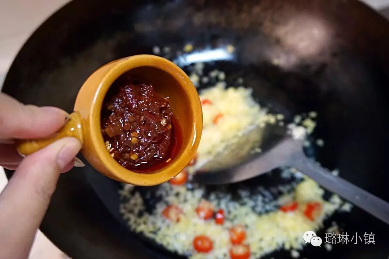2.热锅凉油,等油烧至六成热时爆香蒜末,姜末和辣椒(辣椒只用一半),再加入适量的豆瓣酱,炒出香味后加入适量的水。