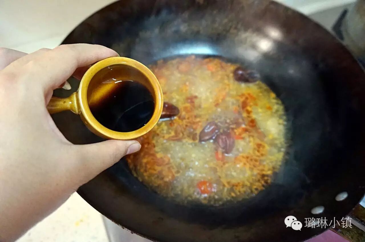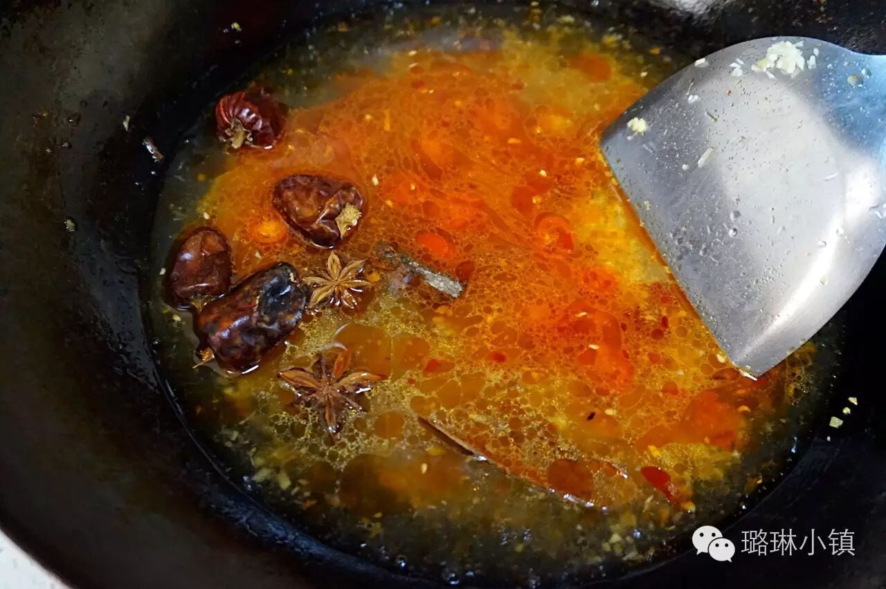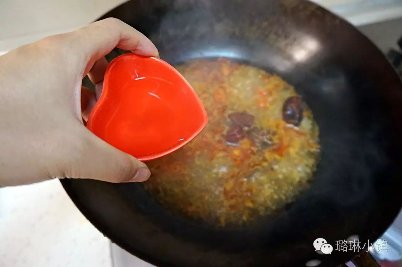 2.热锅凉油,等油烧至六成热时爆香蒜末,姜末和辣椒(辣椒只用一半),再加入适量的豆瓣酱,炒出香味后加入适量的水。