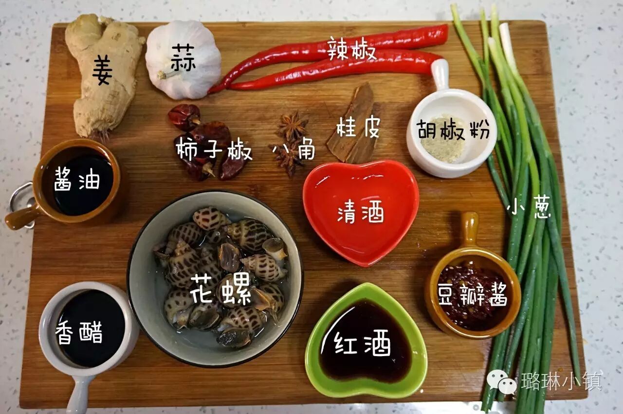 食材:花螺,姜,蒜,辣椒,小葱,酱油,柿子椒,八角,桂皮,胡椒粉,香醋,红酒,清酒,豆瓣酱