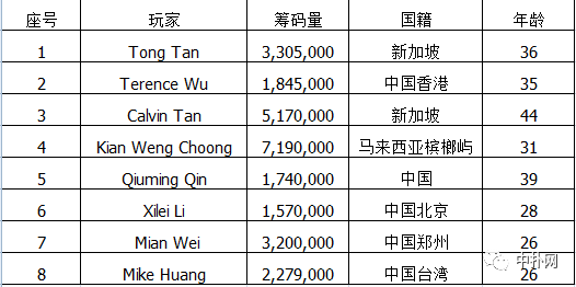 在回顾今天的战役之前,我们先来了解下开战前八名玩家筹码排行情况。排在八位玩家之首的是马来西亚的选手Kian Weng Choong,排在第二位的是Calvin Tan,下图为今天8位玩家座位号排序: