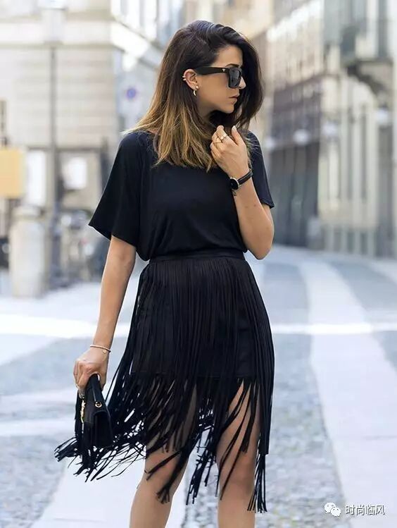 比如简单的黑色T恤搭配黑色流苏裙、