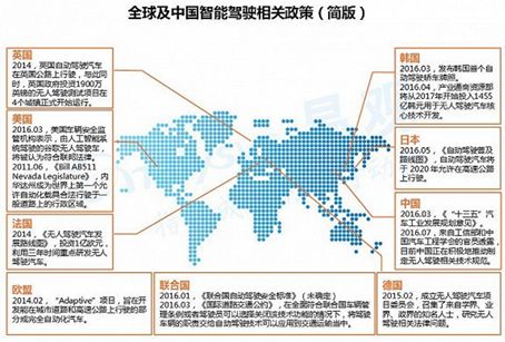 近几年,、美国、欧洲多国、亚洲多国均对智能驾驶制定了多项相关政策,以促进智能驾驶汽车与现有交通系统的融合,并鼓励智能驾驶技术的发展。2016年3月,,允许汽车在特定期间内进行自动驾驶;美国联邦政府认可谷歌无人驾驶车的合法地位。内华达州率先向谷歌颁发许可证,允许谷歌无人驾驶汽车在一般道路上行驶;法国、英国、德国、日本、韩国等均宣布将投入大量资金支持自动驾驶、无人驾驶的相关研究。