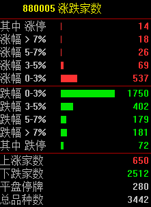 截至到收盘,上涨仅仅650家,下跌2500多家,空头全面主宰。