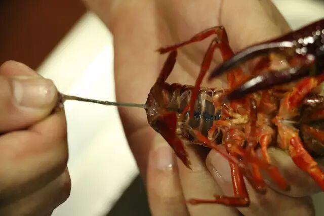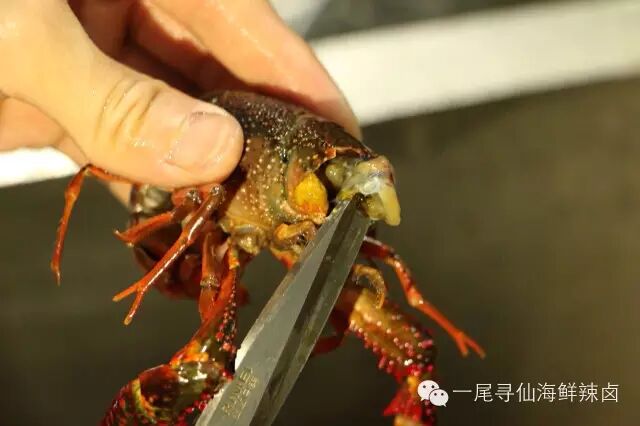 然后是开始清理小龙虾的头污。清理小龙虾的头部可是非常重要的一个步骤,将小龙虾头部和两鳃里的脏东西逐个清除掉,务求让顾客们吃上放心的小龙虾。他们家的小龙虾连头都可以吃喔!