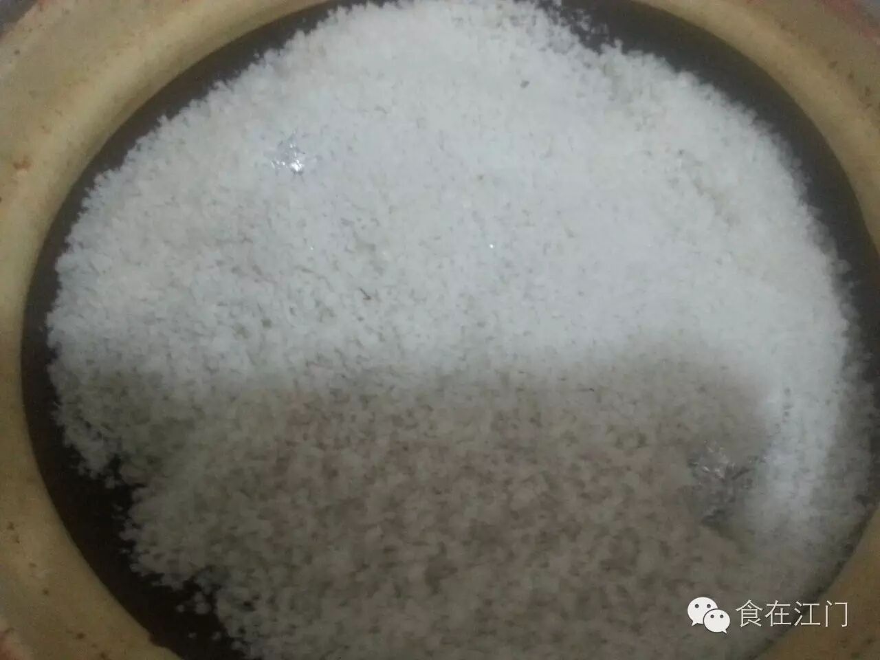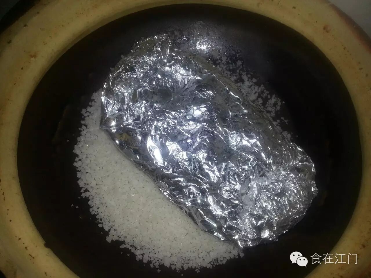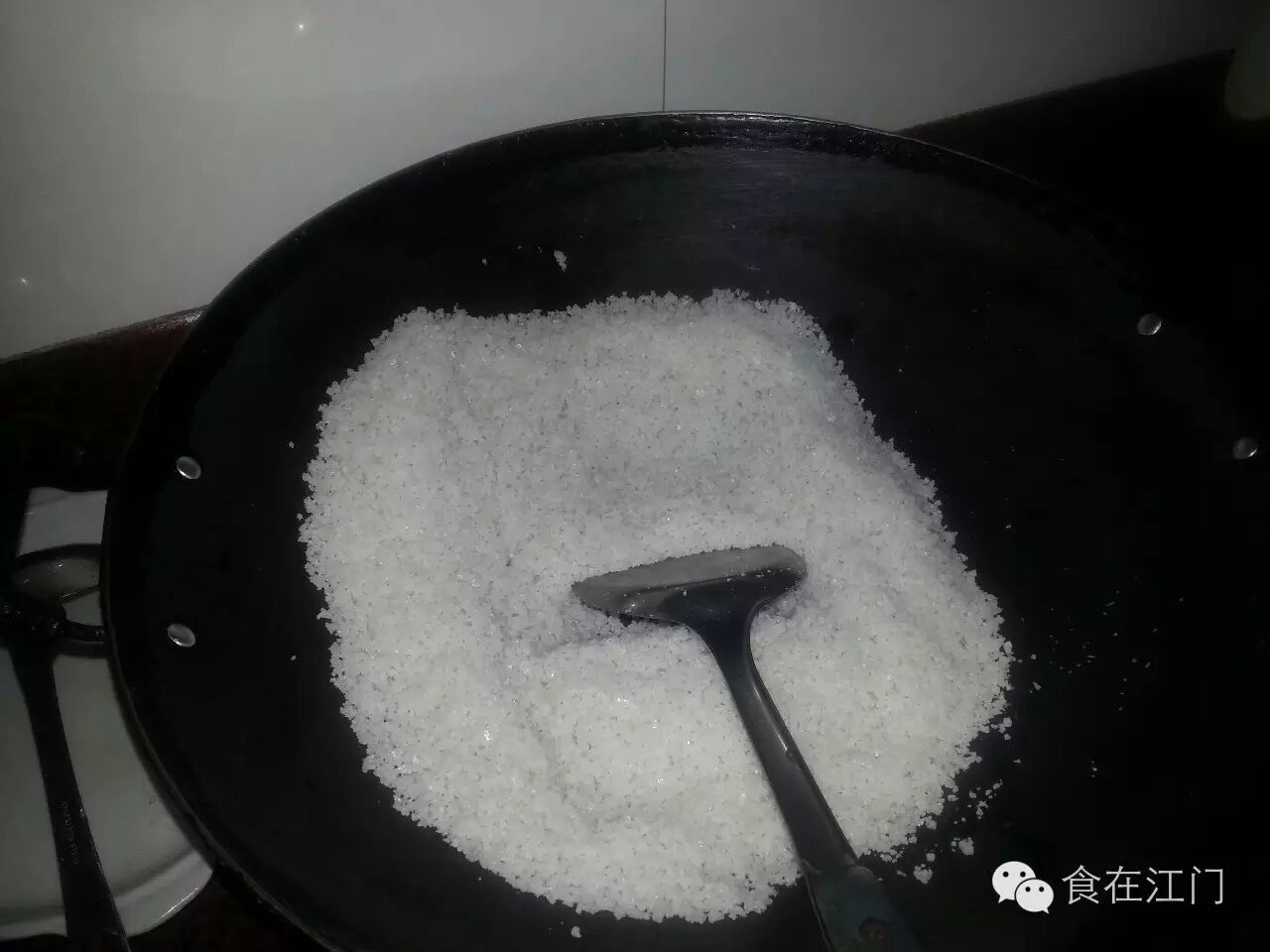 两斤粗海盐用大火炒干后,放1/4到瓦煲底,之后放入包好的花螺,再放入剩余的3/4粗盐