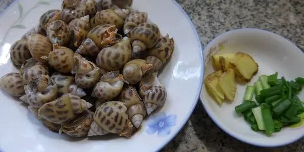 ❥ 准备好清洗干净的花螺,配料:生姜切片、葱段。