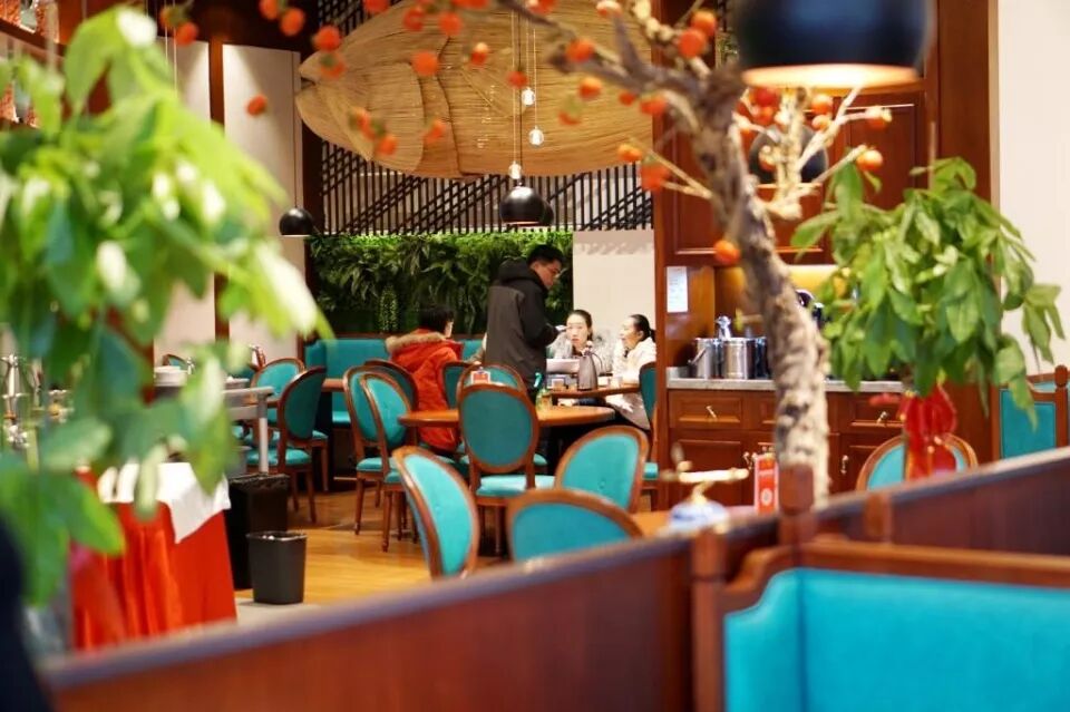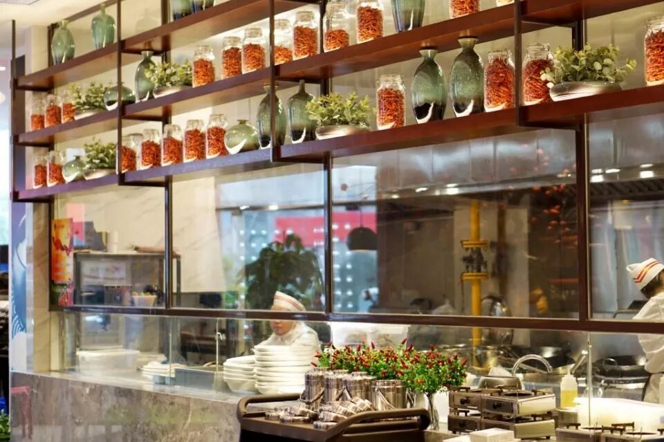 卡座区域显得喜庆,元素和色彩的搭配和谐而舒适,有浓郁的传统中国风情,也有西方现代化元素,空间布局合理,开放式的厨房明亮、干净、整洁,能让食客一目了然,吃得放心。