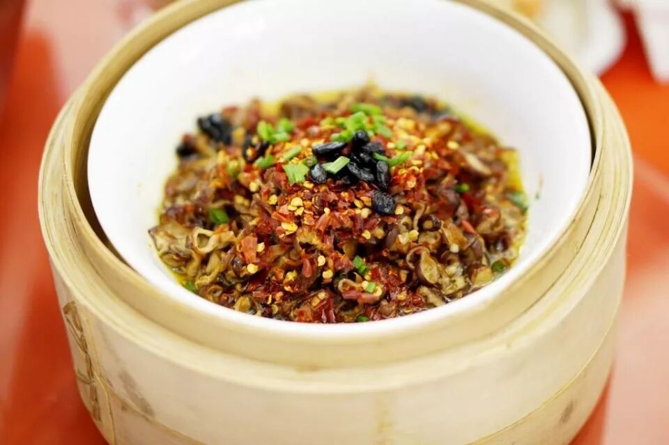 人间至味是蒸菜,精选上佳的米糠肠,切成细丝状,和豆豉、辣椒粉一起蒸熟即可。米糠肠入味鲜美,腊香四溢,带有香辣的口感与豆豉的清香,味道尤为突出。