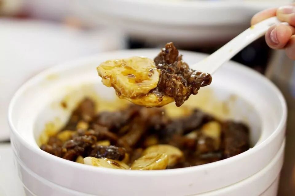牛腩颜色深沉,焖得很到位,松软而富有弹性,味浓酱香;芋头鲜糯芳香,绵软回味,两者结合很完美。