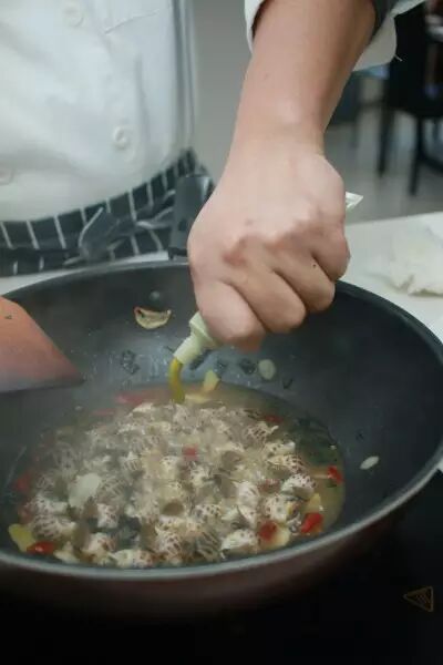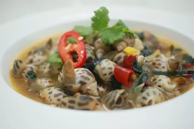 广东人吃海鲜向来以吃原味为主,清蒸、白灼都很常见。但是花螺却不同,花螺有比较重的海腥味,需要采用重味的调味手法去处理,像是盐焗、麻辣,即便是白灼后也要用重味的豉油加芥末蘸着吃。