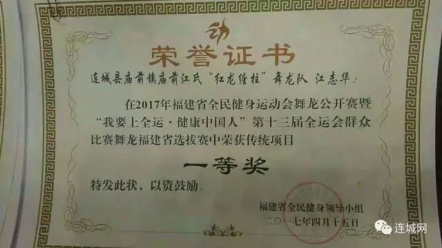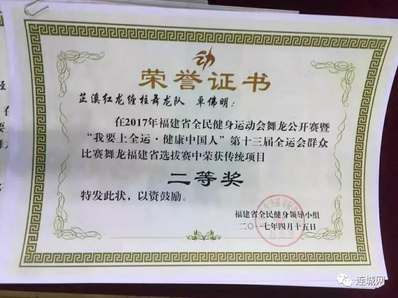 在昨天结束的2017福建省全民健身运动会舞龙公开赛中,,分获大赛一、二等奖。