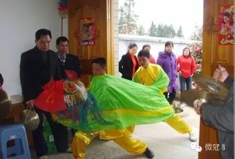 于是舞狮人就舞动狮头来到门口,向中堂以狮头拜上三拜,算是致礼,然后一步一跨地向中堂步步舞进,后面的武师们跟着鱼贯而人。进了中堂,舞狮者在中堂上随着锣鼓声伸缩腾挪使劲舞动布狮,其余的武师们分坐中堂两旁。主人家则端着茶盘向各位武师献茶。待舞完了狮,舞狮者将狮头端放在神案上(狮头面向中堂大门),便开始进行武术表演,表演的项目是:先表演单人拳术和单人器械,器械有:棍、叉、钩、双刀、长柄大刀、双钧、短戟、铁尺等,然后进行双人或三人拳术及器械对打表演,随着锣鼓声的节奏加快,对打也更加激烈,这是最激动人心和最精彩的表演!