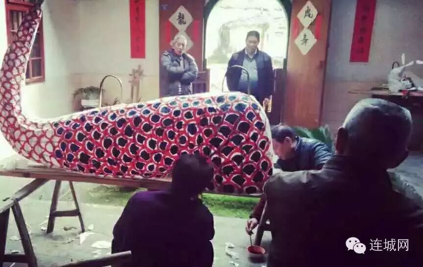 大龙的制作相当复杂,在姑田家家备有龙板,龙板长4米,厚5厘米,宽20厘米,二头凿有一圆洞用以相互连接。而后用长形蔑片制成龙筋龙骨,相当结实,而且每道手续都遵循一定的数字和比例,才能使整条龙保持完整美观。筋骨做好,便开始糊裱,为不使龙身变形和搓皱,龙头、龙身、龙尾各用一定质量纸张糊裱,不可多也不可少。龙身糊裱好后,再用颜料进行画、贴、题,在龙的身上大展文才,诗词、书画、剪纸、美术均得到尽致发挥,村民的愿望也跃然纸上。