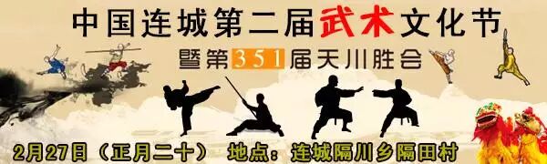 连城县隔田每年的农历正月二十定为各村舞狮武术队聚会竞技的节日,叫“天川胜会”。这天,十乡八寨的舞狮队会从四面八方涌向隔田村相聚比武。各色狮队在十番乐队的伴奏下在黄氏宗打前的大坪上各献技艺,煞是壮观。狮舞结束后,就表演拳械格斗,刀光剑影,闪展腾挪。