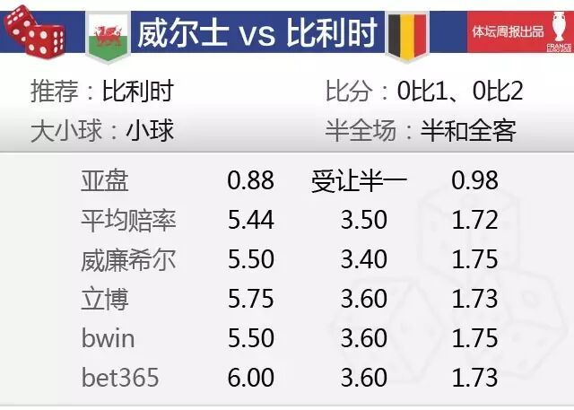 本场亚盘初盘比利时让半球,目前普遍升盘为比利时让半一,而且上盘的水位还在不断下降,走势方面对比利时比较支持。本场庄家开盘力度始终都给比利时一定的支持,应该说他们还是表明了态度,造势诱盘的可能性不大。欧赔比利时获胜的数据比较齐整,主流公司都是给出1.70-1.75之间。平局目前普遍在3.60之上数据有些偏高,而威尔士获胜相对赔付率则是较高。在晋级赔率方面,比利时1.35的数据远远低于威尔士的3.32。比利时现在逐渐进入了比赛状态,虽然有后防主力缺席但整体实力依然强于对手,目前形势下小胜晋级可能性很大。