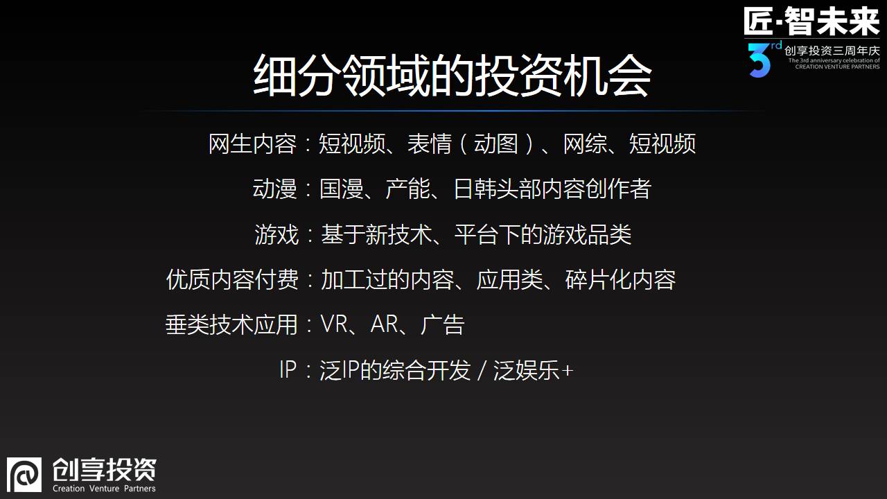创享一直在宏观导向下寻找细分领域的投资机会,比如网生内容,动漫,游戏,优质内容付费等。创享时刻都在思考的IP价值,并且寻找头部内容产生的机会。我们一直做的事情从内容到IP到综合开发的纵向产业链的节点投资,包括头部内容结合、次头部内容的价值升级,泛娱乐+系统化打法。IP的孵化是一个很漫长的过程,创享希望未来可以通过横向产业链的整合,形成IP的加速器,让IP周期可以缩短。