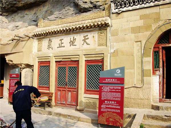 ,距今已有500余年的历史。,两侧则是十殿阎君。该洞的圆形藻井石雕更是吸引了记者的眼睛:莲花聚顶,外有道家的八卦图案,以龙凤为主图案,外围则以莲花为衬。整个图案造型优美,栩栩如生,手法细腻,具有极高的历史和文化价值。