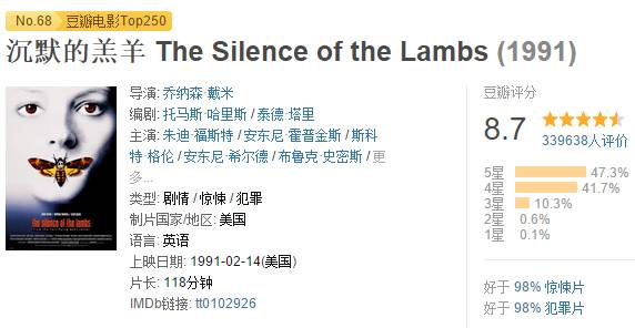 《沉默的羔羊》豆瓣33W人给出8.7的高分。