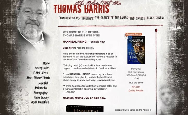 哦不,这是托马斯·哈里斯老爷子的官网。左上角那个看起来很慈祥的爷爷就是他。