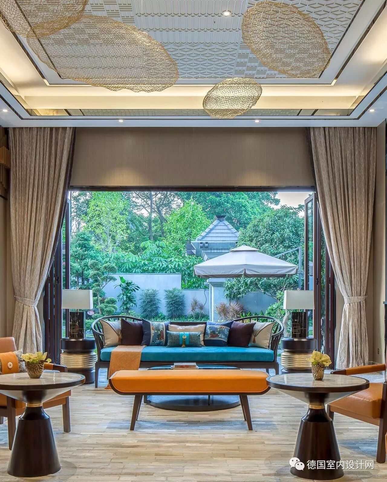 Itis a bold design to applya symmetrical layout for the parlor. The ceiling witha specific pattern, the lantern in concise style, the match of lake blue andsunset orange, the furniture covered by traditional pattern texture, all thoseelements in the parlor present a Chinese favor through western method,wish tolet people catching a glimpse of a elegancy in crowd.