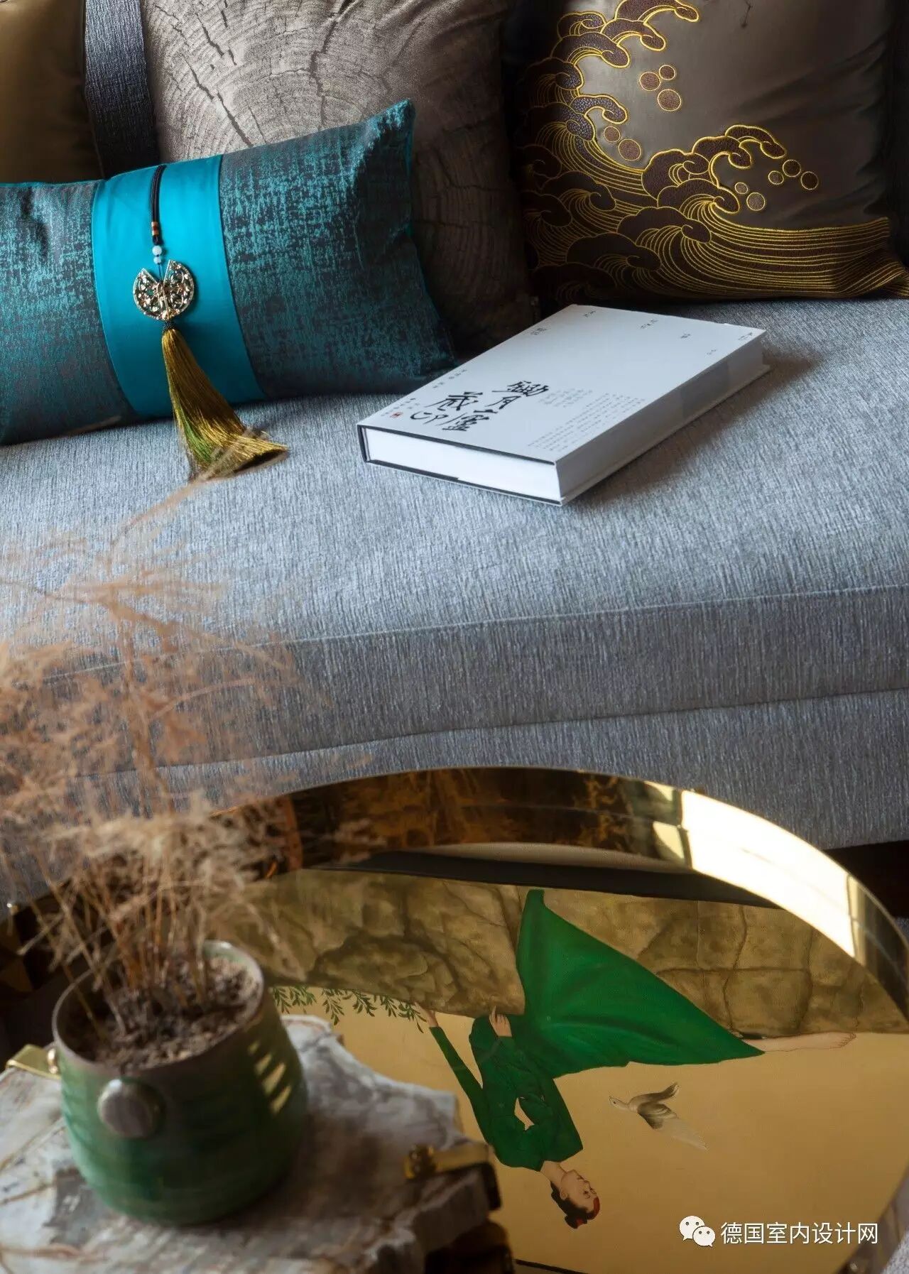 对称式布局的会客厅融汇了设计师的大胆塑造。复杂而隆重的天花纹样、简洁现代的艺术云灯;湖水蓝与落日橙的搭配;中式纹理搭配现代的家具等等。用不拘一格的西方审美营造静谧的东方美学。正如在喧嚣处寻觅逸趣风雅,怡然自得。