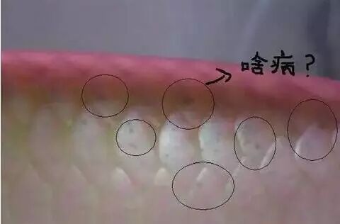 症状:水霉,鳞片表面或者是边缘有点状或片状白毛