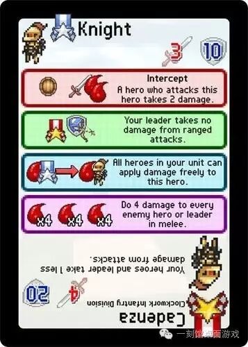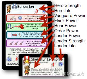 一张卡牌一边代表作为英雄时的攻击力和血量和能力,其中红色表示作为前排时的能力,绿色表示作为中排时的能力,蓝色表示作为后排时的能力,紫色为不入场代之以一次性效果。另一边为作为领袖时的能力,攻击力和血量。