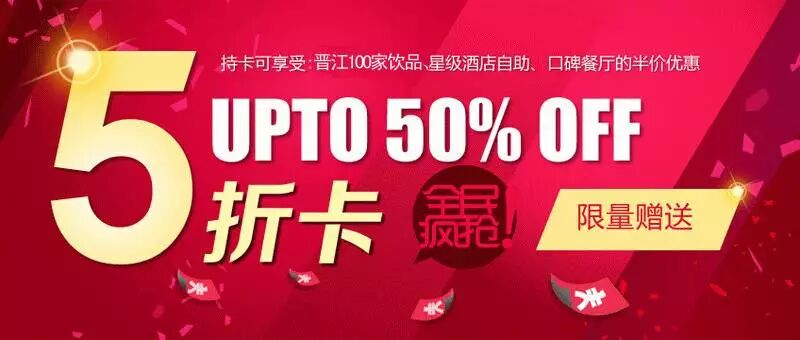 优惠活动:每周三凭晋江五折卡可享受消费50元以内打5折,优惠金额不超过25元