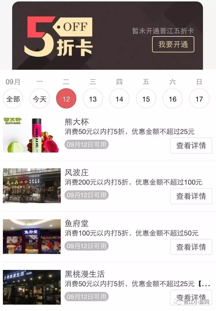 每周三凭晋江五折卡可享受消费50元以内打5折,优惠金额不超过25元