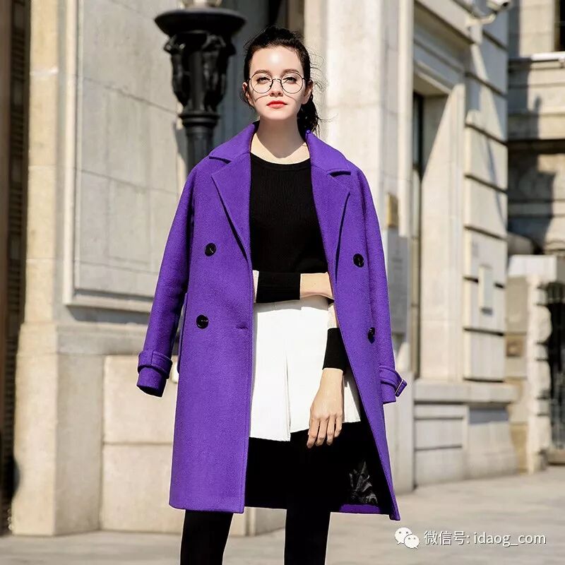 能驾驭紫色的女生不一般,双排扣大气又美观,搭配黑色打底裤,女王范儿满满,宽松廓型时尚有范不挑身材,轻松穿出欧美街拍范,娇眉也能轻松hold住。