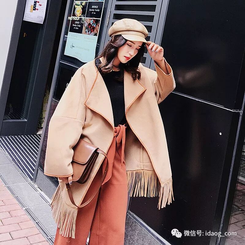 oversized宽松廓形,环肥燕瘦都好驾驭的百搭款,拼接的铆钉流苏下摆也是一大亮点哦,走起路来很灵动,不失英伦范儿~蝙蝠袖设计视觉效果会更显瘦,经典的翻领也是近年流行的时尚元素,告别大众款穿出腔调来,出门再也不怕撞衫,搭双小脚裤和短靴就能美美出门。