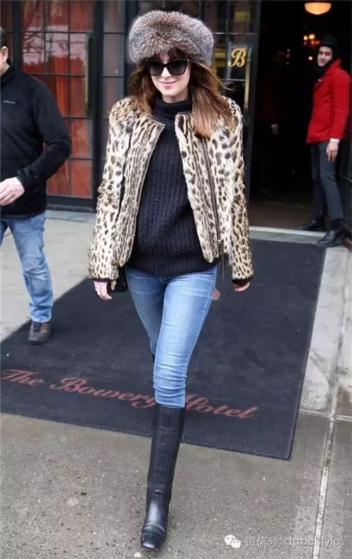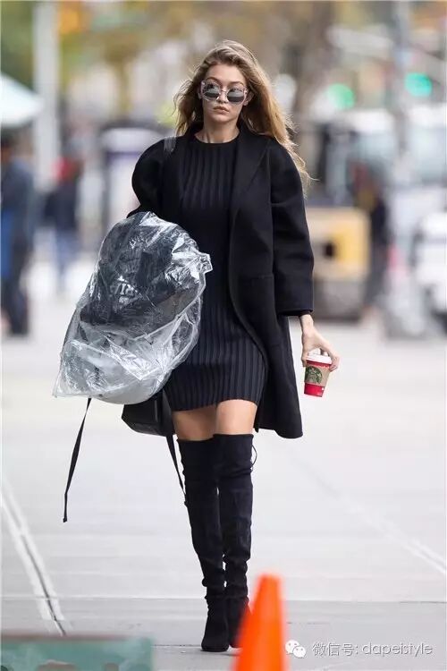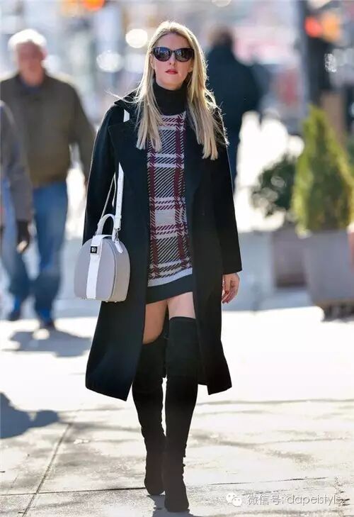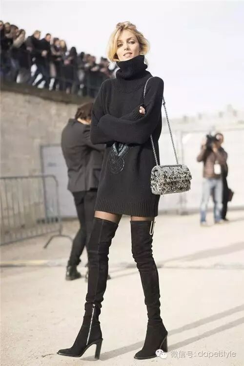 长靴与大毛衣搭配在一起,这样的经典CP,我不得不把它放在第一位,编编是非常喜欢的,但是大家都知道编编是梨形身材,只能干看着的份儿了,但是这样集柔美与性感于一身的LOOK,真的不要再潮了。
