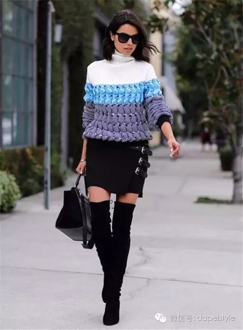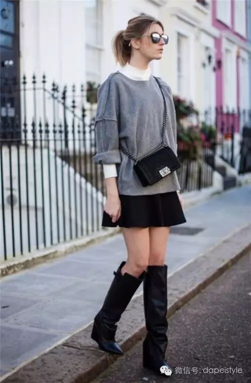 毛衣与半身短裙搭配在一起,不仅时髦还增强了层次感这时穿上一双长靴带来一丝女人味。而且这身搭配比较适合小个子女生穿,露出一点点肌肤不仅显高还很性感的样子。