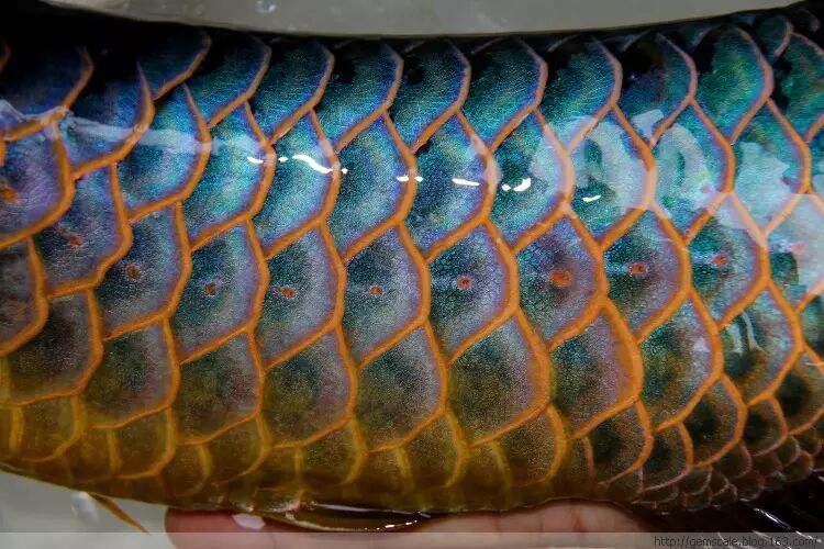 3、与金色的相界方式十分独特,金色如同是用极细的笔勾在鳞片的最外缘,但感觉是在同一平面上的;若金色呈较松散的金砂状或感觉突出与鳞底,则吃框的可能性较大。