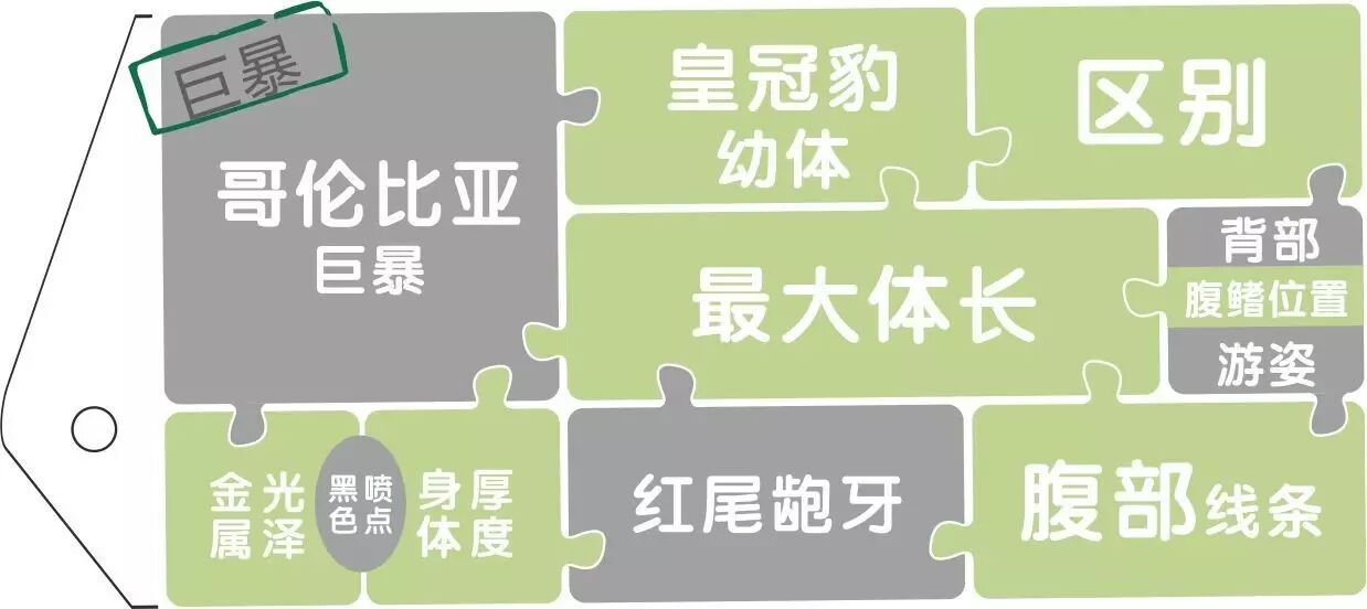 首先最基本的是区别巨暴和皇冠豹幼体。这一问题在“大鱼列传”中已有涉及,主要区别在于腹鳍位置(巨暴:下方;皇冠:两侧)、背部和腹部线条、游姿(巨暴:水平;皇冠:倾斜)等方面。