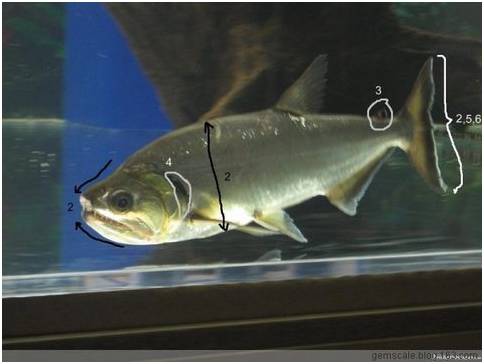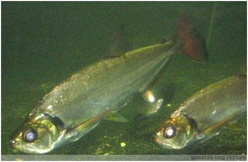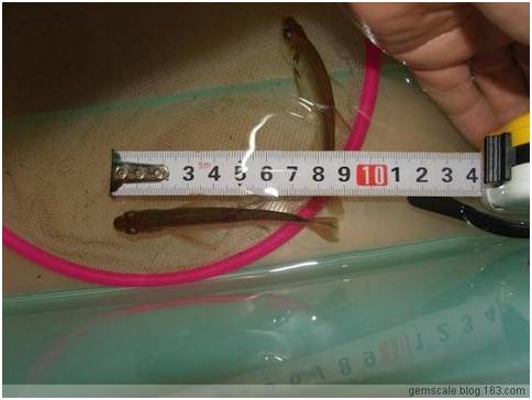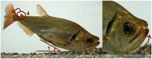 以上为我归纳的要点,但观察实物并非如此明显,特别是8公分以下的小鱼,需要仔细观察比对。还有一项诀窍就是巨暴幼体鳃盖上有黑色喷点而其他暴牙的幼体没有,这也是区分的重要标志。区分10公分左右巨暴和红尾暴的决定性环节在于尾鳍最外圈是否具有窄窄一道白色镶边。但可能因为个体较小而不够明显需要详加观察。另外巨暴和红尾暴的10公分以下幼体都可能会带有金色光泽,此节并非区别的主要依据。