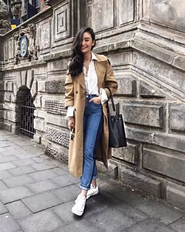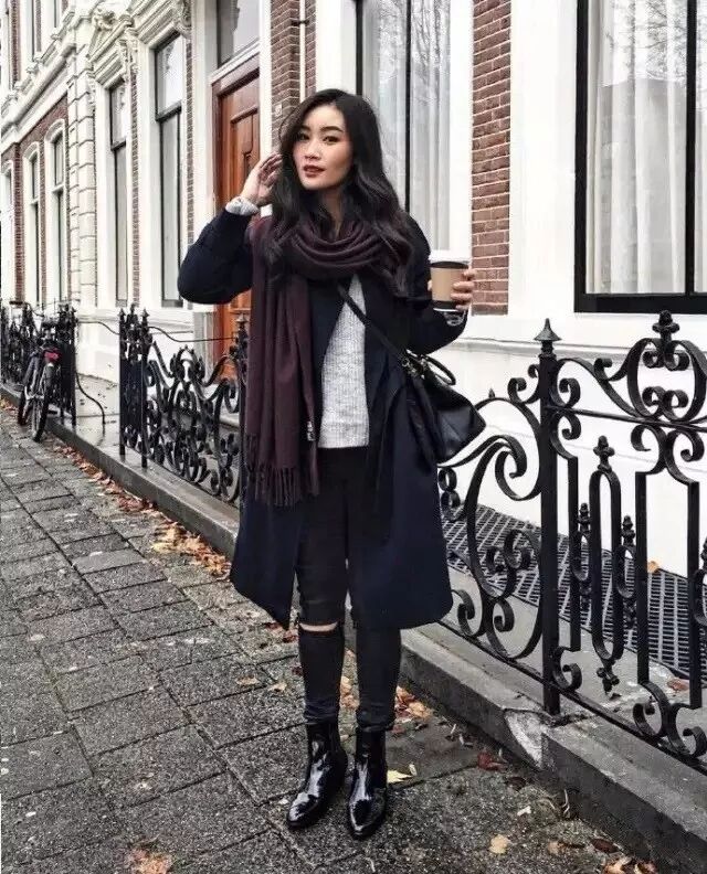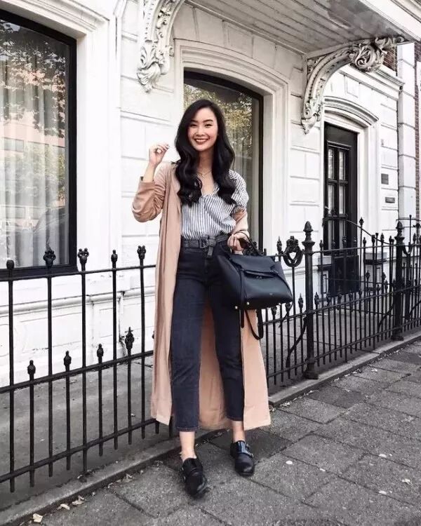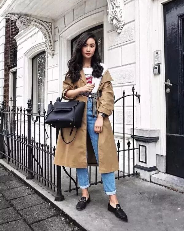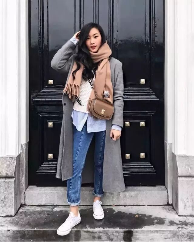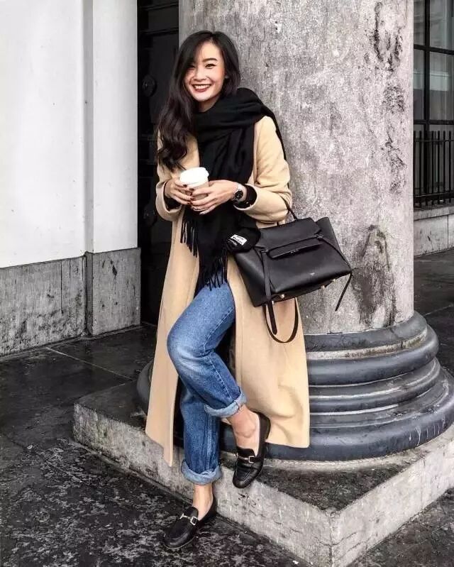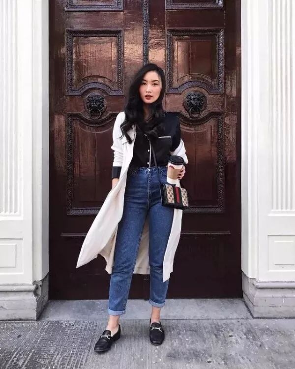 直筒牛仔裤和长外套的组合也是有型又拉风,还带着一些复古韵味,把裤脚挽起可以显得腿长哦,如果怕露脚踝,可以选择好看的袜子来保暖。