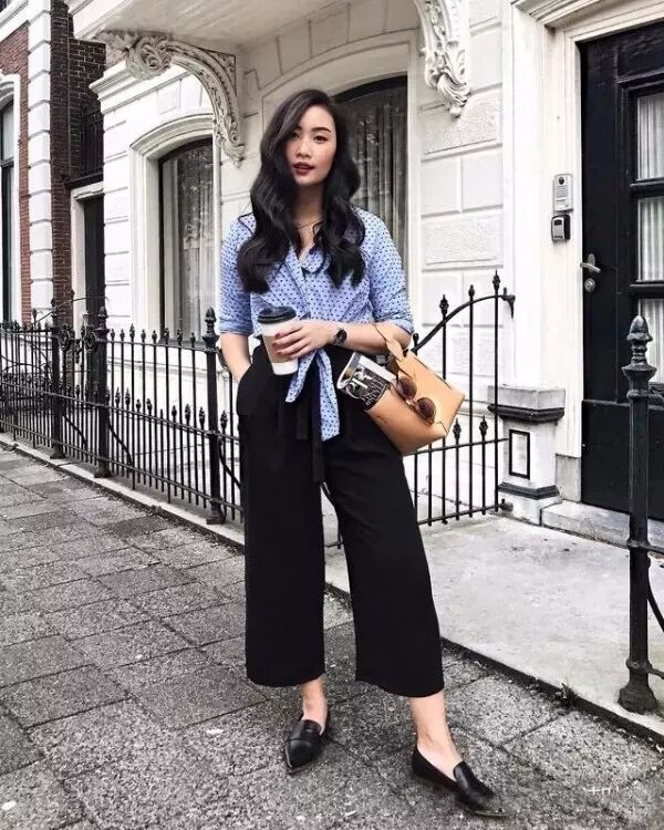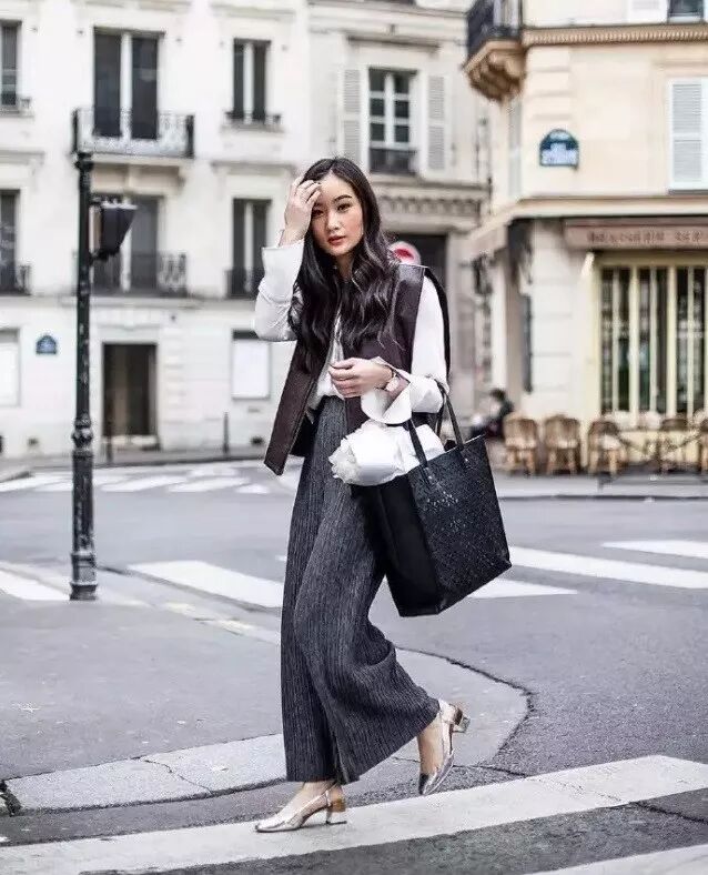 阔腿裤不仅是提升气场的宝物,更是修饰你小粗腿的救星,同样记得制造腰线,立显大长腿。
