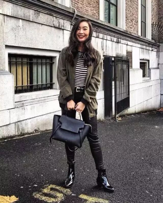 亮面漆皮短靴在搭配黑色裤子或是黑色裤袜不但可以从视觉上延伸腿部线条,也能减掉不少沉闷感,Levi又是一双N个造型。