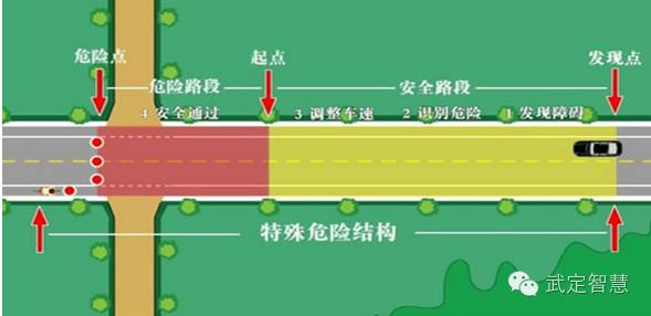 所驾车与影响正常行驶的情况(障碍)之间必定存在发现点、起点、危险点。只有在安全路段采取预防措施,并延展过危险路段,才能避免事故。这个规律称为“三点两段定律”。